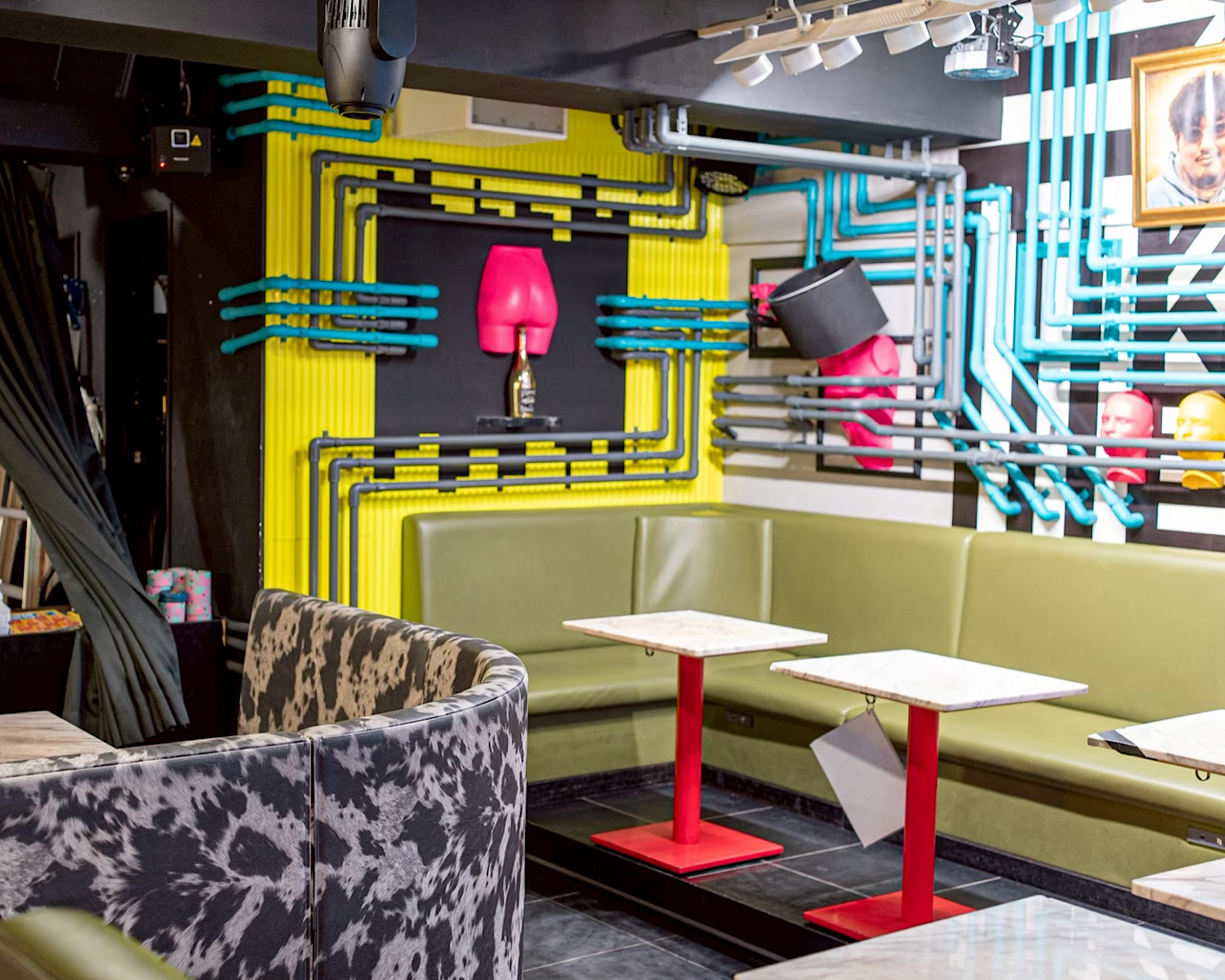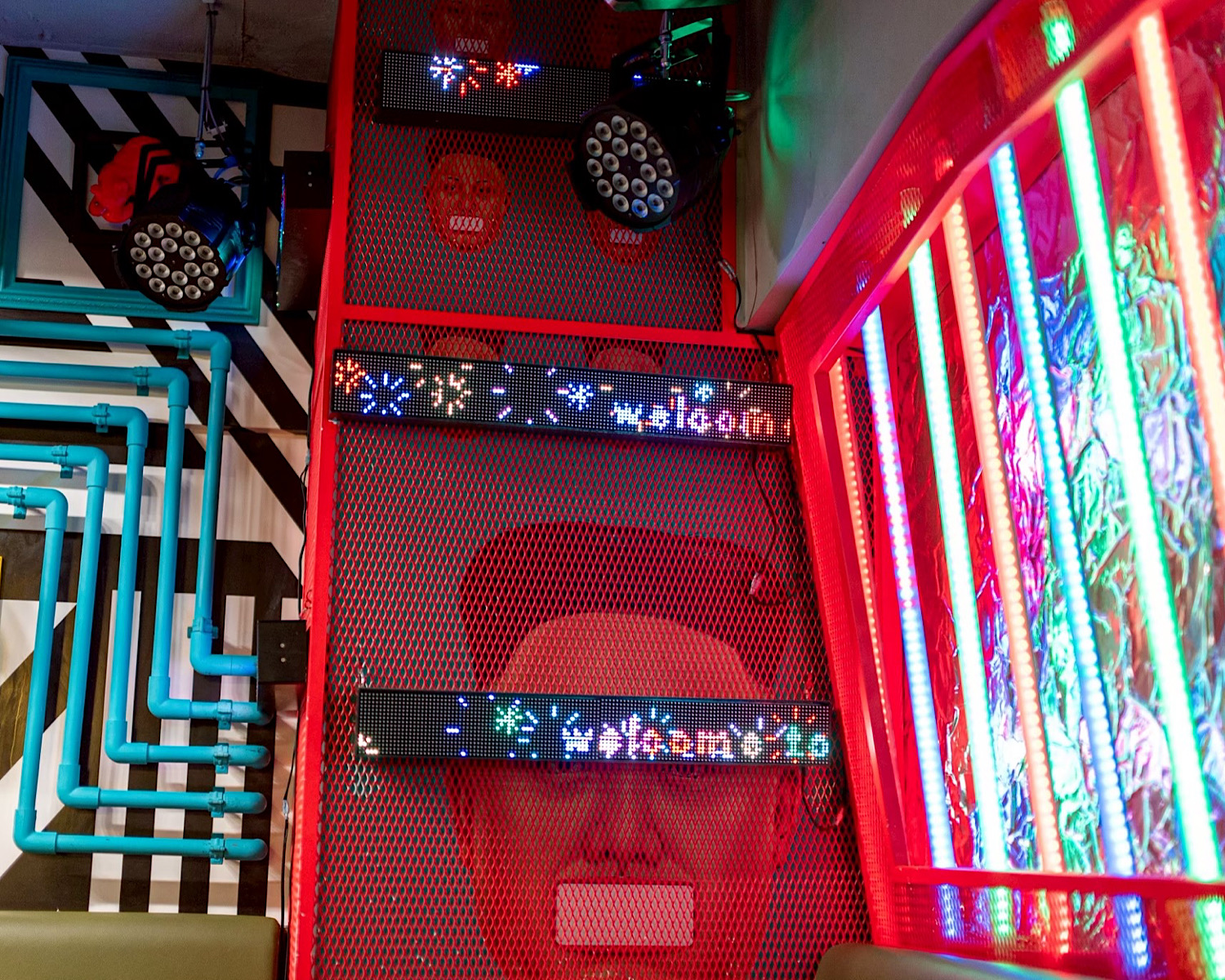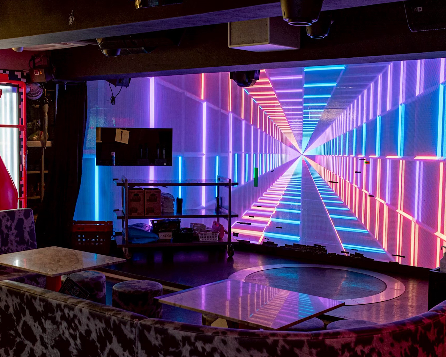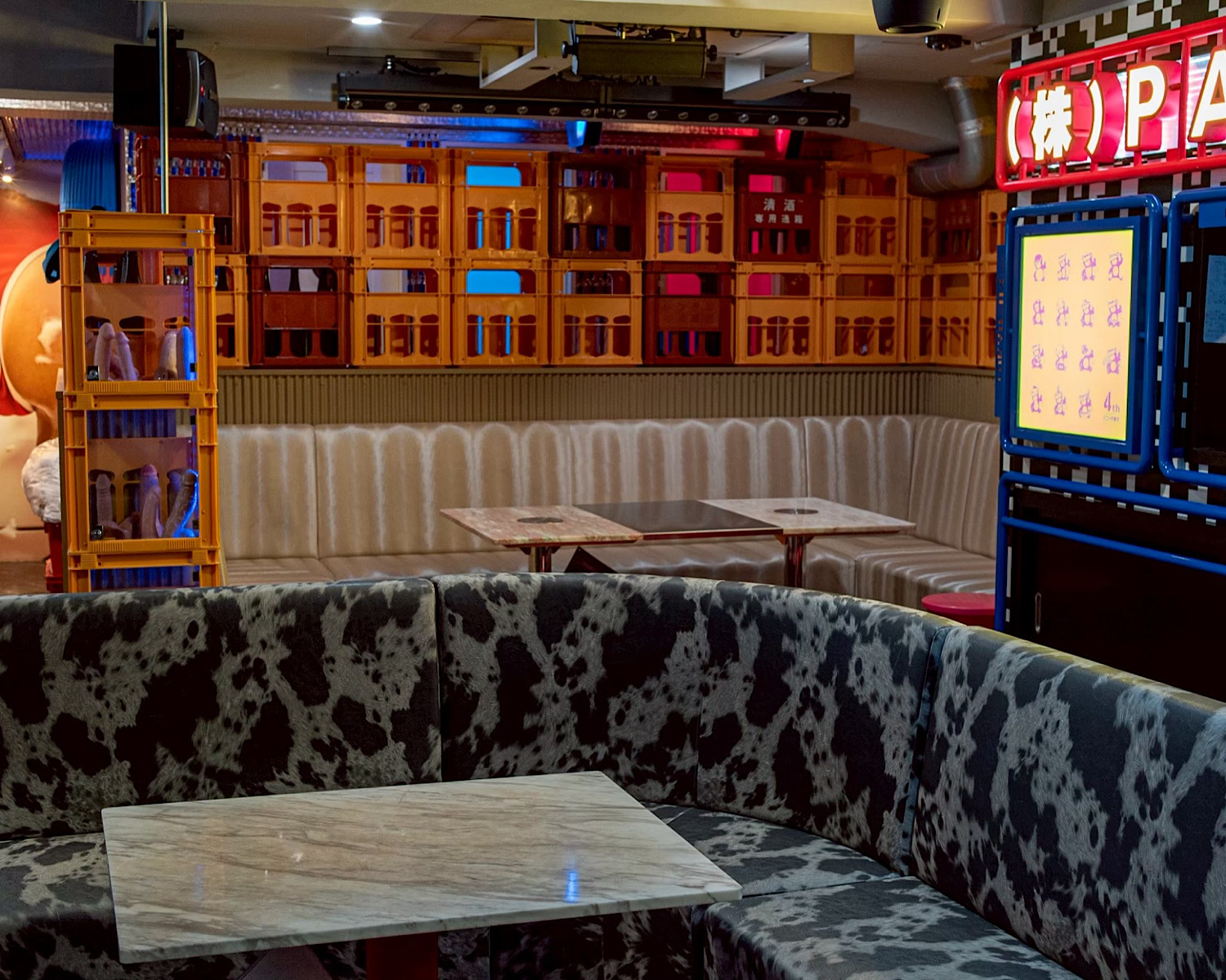 | 機材・設備 | 【スペースの特徴】 ・ネオン系 ・大きいスクリーンあり ※映像演出(有料) ・全スペース喫煙可能 ・照明常備で使用可能 ・スモーク演出可能(有料)