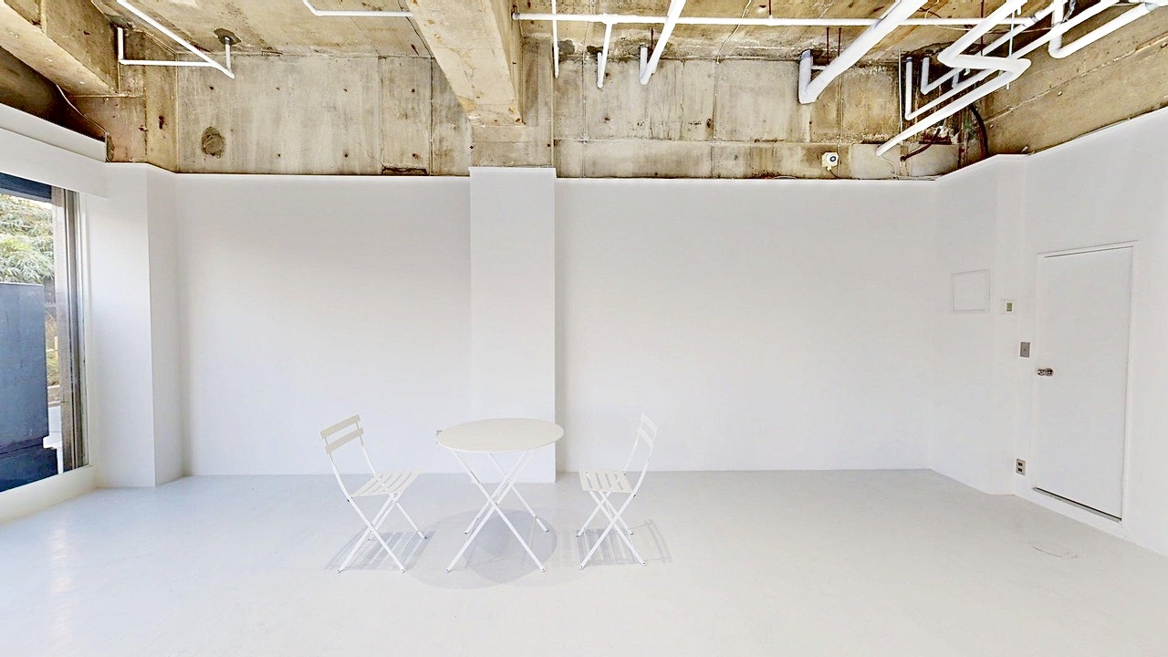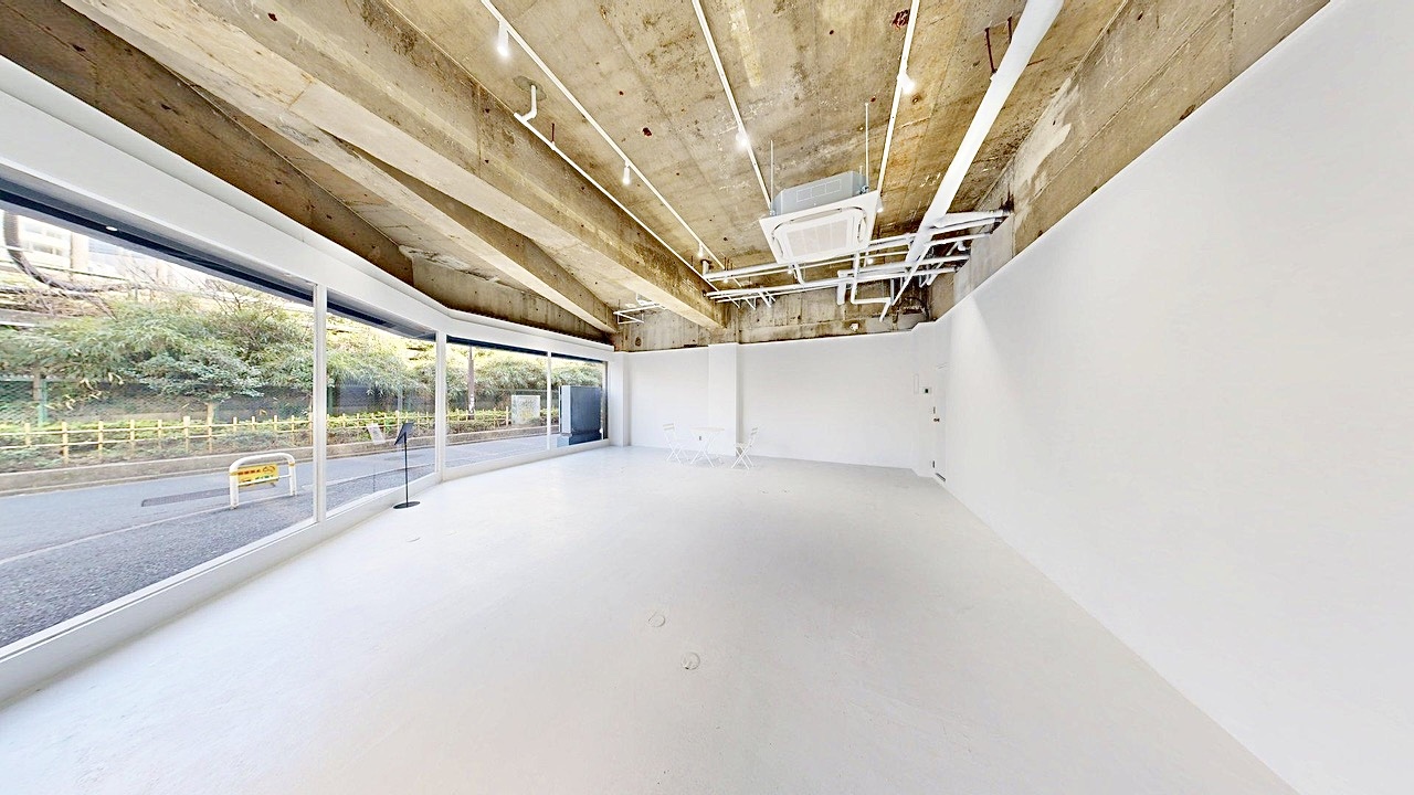 広さおよそ70㎡。1階路面ウォークイン、角地のガラス張りの外観。白壁、白のフロアに3.8mという高さの天井が印象的な会場です。